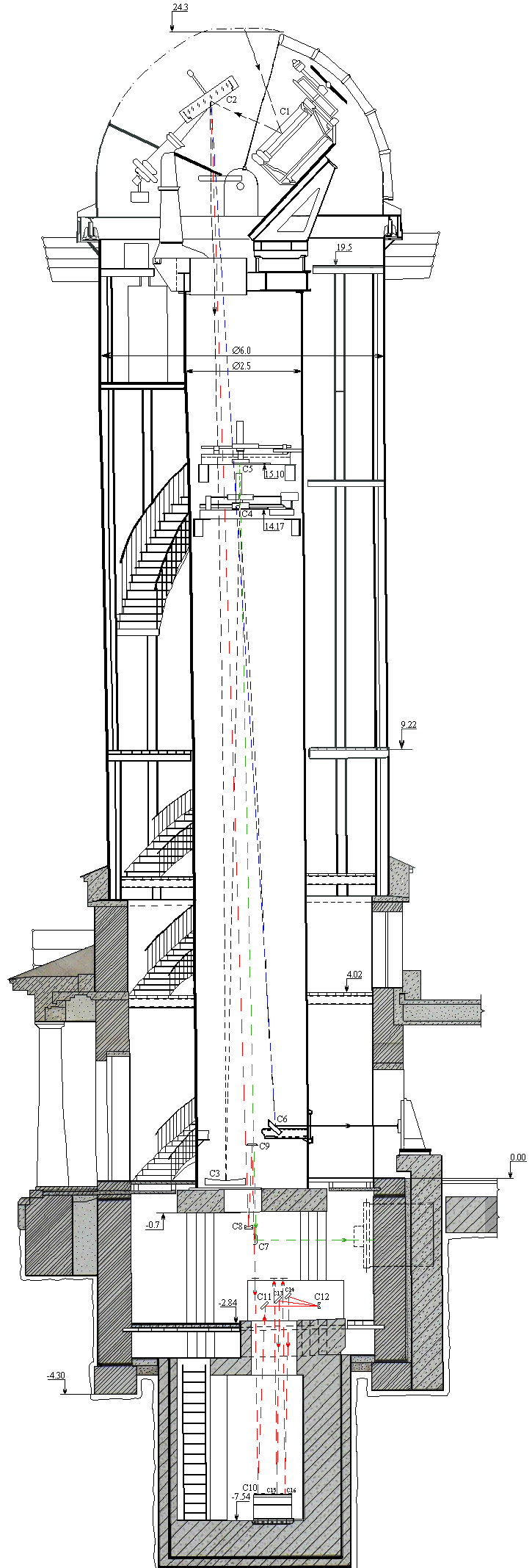 В случае, когда вместо кассегреновского зеркала С3 используется зеркало С4, пучок от него (зеленый цвет) направляется в подвал телескопа, где плоское зеркало С7 направляет его на щель вакуумного спектрографа. Там формируется изображение Солнца диаметром 70 см.
