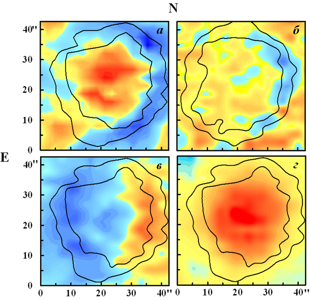На рисунке справа приведен один из примеров наблюдений одиночного пятна на Солнце, которые были получены 13.09.1978 в разных спектральных линиях. Границы тени и полутени пятна показаны черными линиями на всех рисунках. На магнитограмме (г) видно, что магнитное поле в пятне S-полярности (красный и желтый цвета) и сосредоточено в тени пятна. На рисунке (в) показано распределение лучевой скорости в фотосферной линии Fe I 525.3 нм. Синим цветом показано движение вещества к наблюдателю, красным - от него. Такая картина характерна для всех пятен, и называется эффектом Эвершеда. Она показывает, как было установлено, что наблюдается вытекание вещества из пятна на уровне фотосферы. На рисунке (б) показано такое же распределение лучевой скорости в пятне, но в линии Fe I 517.2 нм. Она образуется в области температурного минимума. Как видно, направленных движений Эвершеда здесь нет. На этой высоте движения плазмы в пятне незначительны и не имеют преимущественного направления. На рисунке (а) показано поле скоростей в хромосфере - в линии Н-бета. Видно, что здесь преобладают движения от наблюдателя, а эффект Эвершеда имеет противоположный знак. Это означает, что на этом уровне вещество вливается в пятно. |