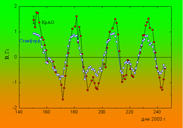 Общее магнитное поле впервые стали наблюдать на БСТ-1 в 1968 г. Для этого солнечный пучок направляли с целостатной системы прямо на щель спектрографа. Значения этого поля оказались небольшими - как правило не более 2 гаусс по абсолютной величине. Для регистрации таких значений необходим высокочувствительный магнитограф. Кроме этого, оказалось, что для уверенной регистрации такого слабого сигнала нужно проводить измерения как в магниточувствительной линии, например, в Fe I 525.0 нм, так и в линии, полностью нечувствительной к магнитному полю, например, Fe I 512.4 нм. Это позволяет правильно учесть "ноль" магнитографа и получить истинную величину магнитного поля. Измерения общего магнитного поля в дальнейшем стали проводиться и в других обсерваториях - Маунт Вилсон, Станфорд, Иркутск, Сезерленд, Китт-Пик. Современный каталог общего магнитного поля включает более 20 тысяч суточных измерений с 1968 г. по настоящее время. На рисунке показан пример одновременных измерений ОМП летом 2003 г. в двух обсерваториях - КрАО (красный цвет) и Станфорд (белый цвет). Данные очень хорошо коррелируют друг с другом, хотя есть отличия в абсолютных величинах поля, вызванных особенностями инструментов и калибровкой измерений. |